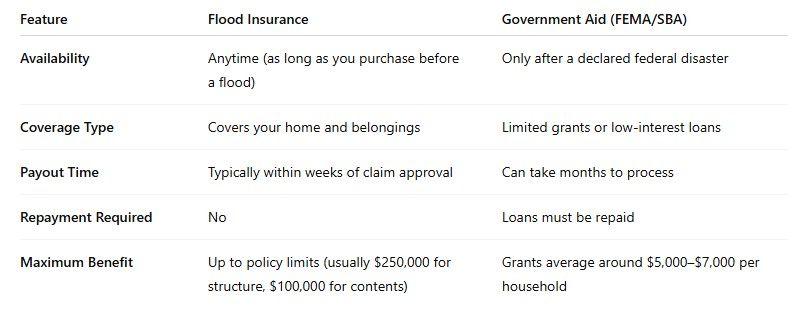Flood insurance and government aid aren’t competitors—they’re complementary safety nets. In fact, FEMA often encourages homeowners to carry flood insurance because it reduces reliance on federal aid.